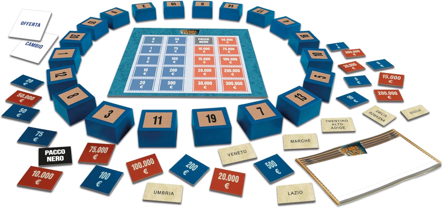 AFFARI TUOI: il popolare game show televisivo "Affari tuoi" arriva sulla tavola, per divertirsi in compagnia della famiglia e stimolare strategia e ingegno tentando la fortuna con i celebri pacchi IMPARARE GIOCANDO: gioca di strategia, accetta l'offerta del dottore o tenta la fortuna per ottenere il premio più ricco, senza tornare a casa a mani vuote COME GIOCARE: in base al numero di giocatori, ci saranno conduttore, dottore, concorrente e accompagnatore; obiettivo del gioco è ottenere il premio più ricco senza farsi ingannare dall'offerta del dottore COSA CONTIENE: gioco Made in Italy con 1 tabellone, 20 pacchi, 20 tessere premio, 1 blocco assegni e un regolamento per scoprire tutte le regole del gioco