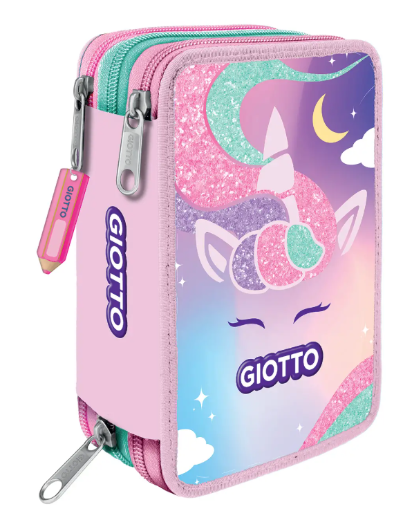 Astuccio Giotto 3 zip in poliestere 900D impermeabile, resistente e di alta qualità, perfetto per l'uso quotidiano a scuola. Design trendy Catty Candy con dettagli glitterati e fantasie Unicorn, Cate Sweet Cat per uno stile unico e colorato. Dotato di charm matita in gomma personalizzabile, per un tocco personale e originale. Assortimento premium completo: pastelli Supermina, pennarelli TurboColor, matite, penne, colla, righello e forbici. Compatto e glamour, misura 12,9x19,5x7,5 cm, ideale per organizzare e trasportare tutto l'occorrente scolastico.