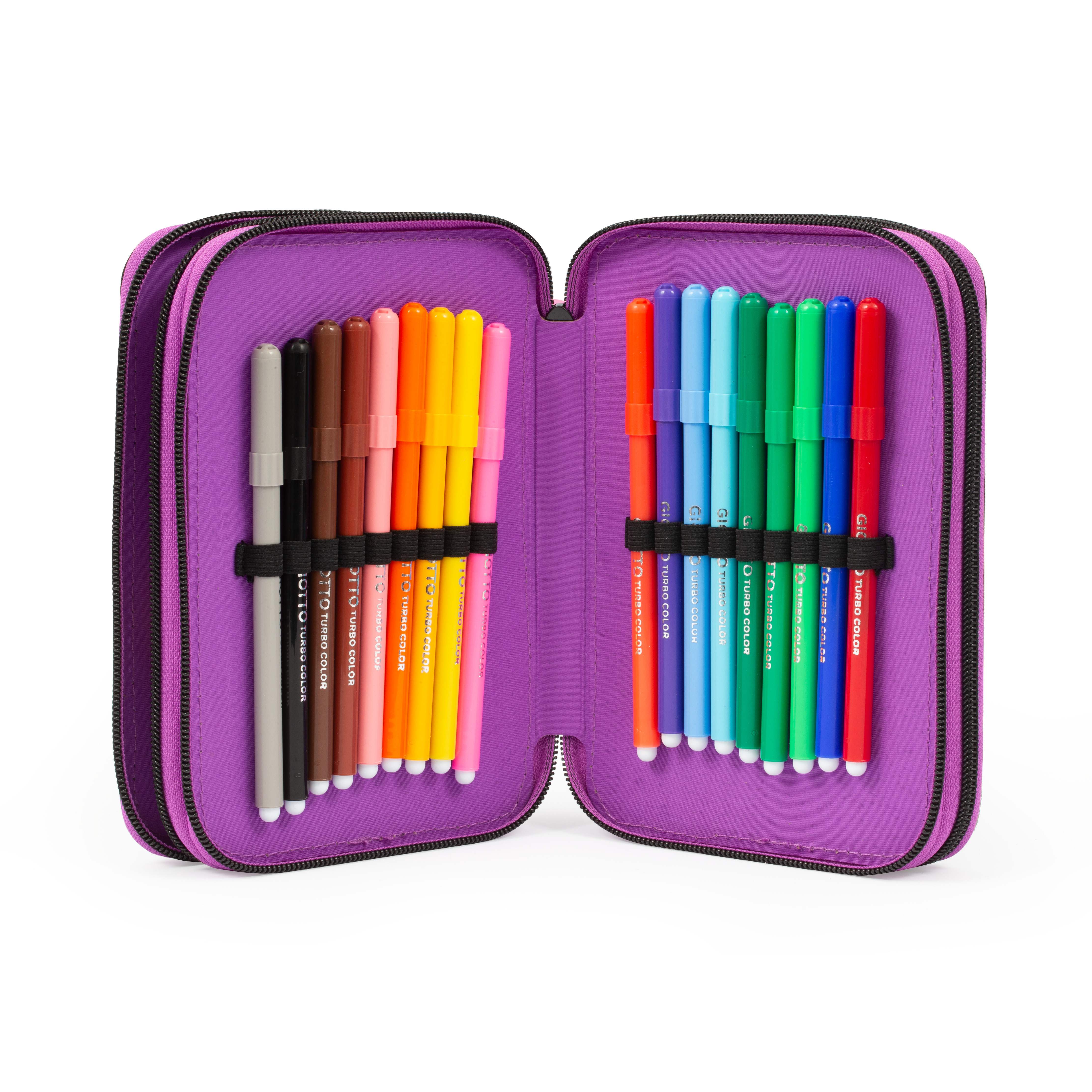 Confezione 18 matite colorate, 18 pennarelli, 1 penna sfera blu o nera, 1 penna a sfera rossa, 1 matita, 1 gomma, 1 righello, 1 temperino, 1 paio di forbici