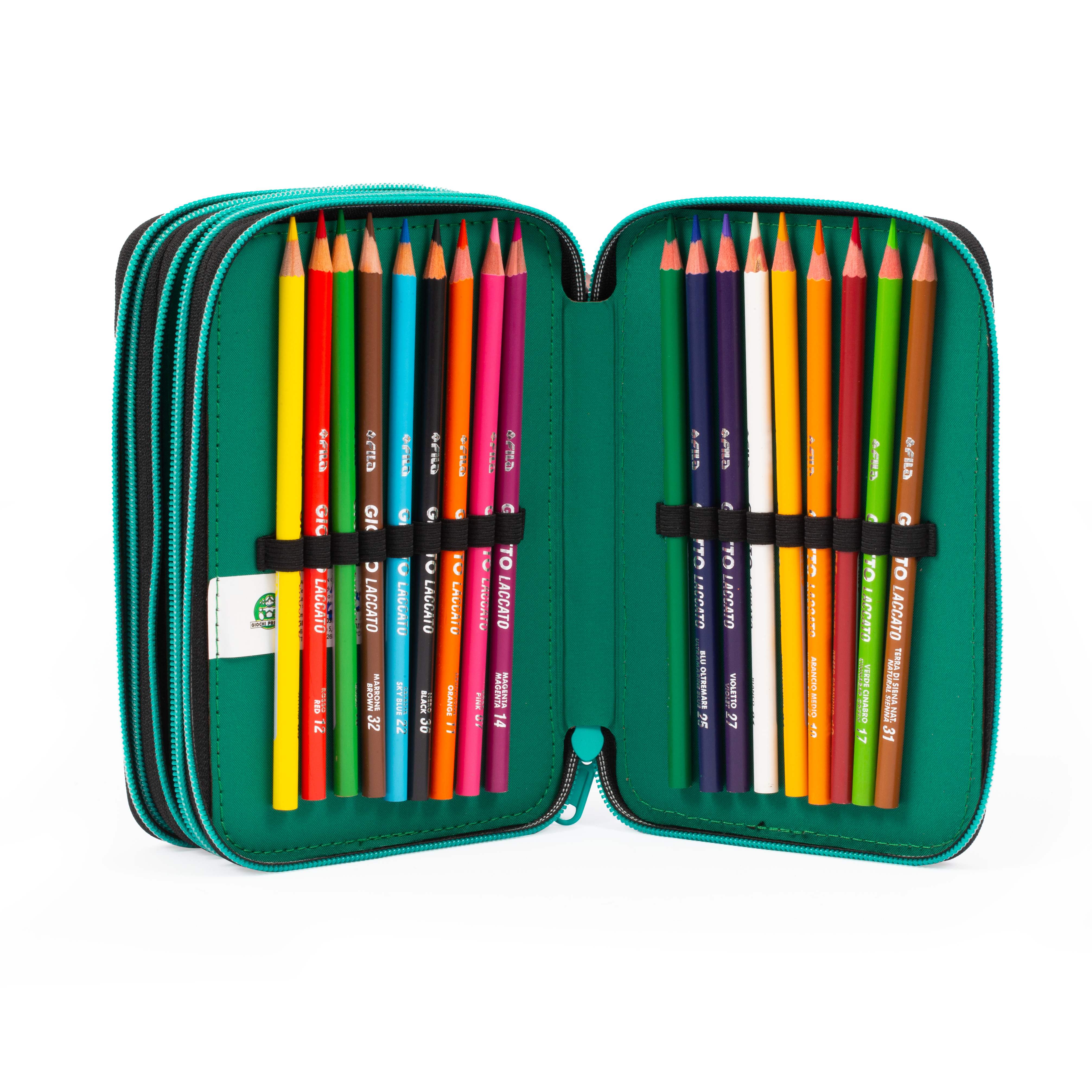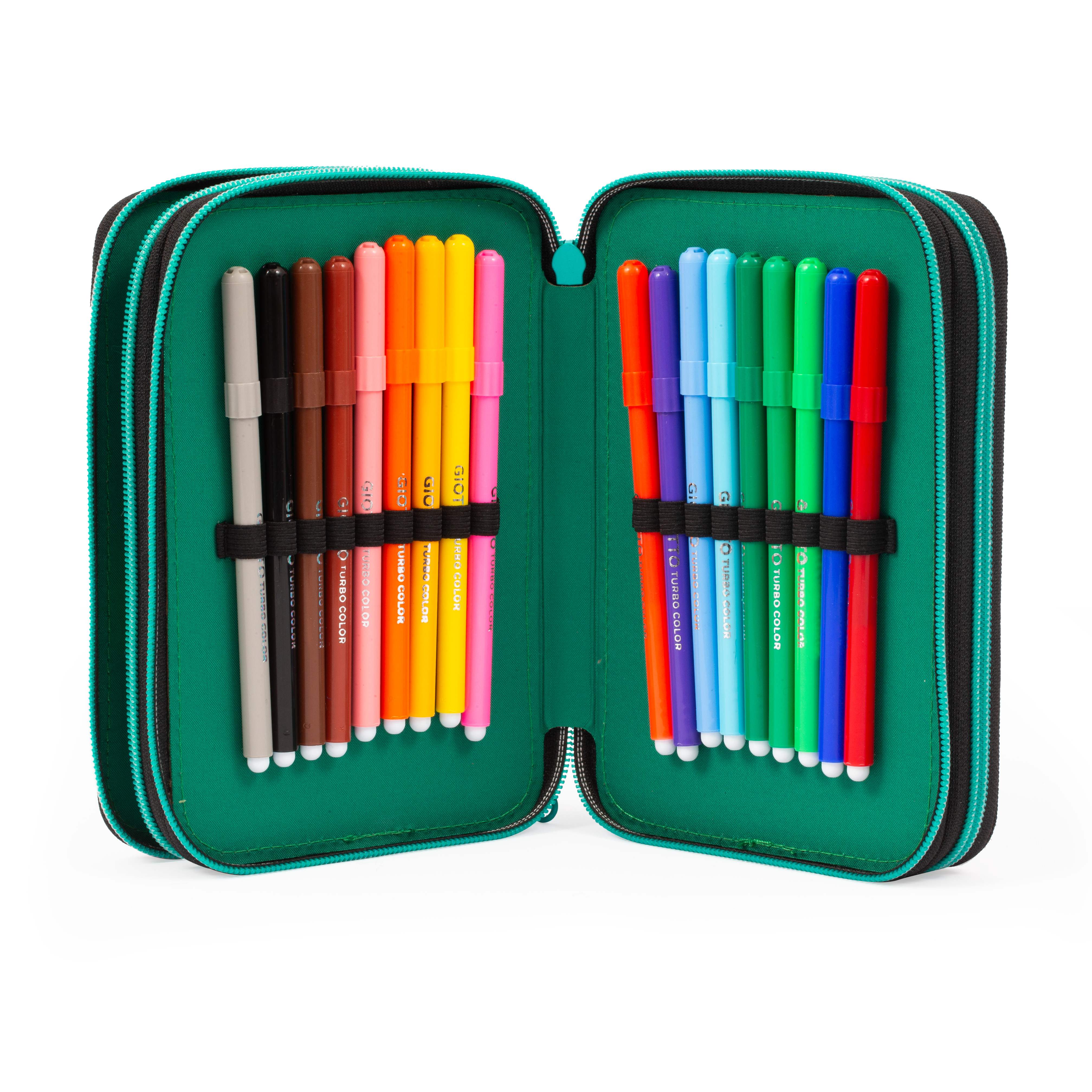 Confezione 18 matite colorate, 18 pennarelli, 1 penna sfera blu o nera, 1 penna a sfera rossa, 1 matita, 1 gomma, 1 righello, 1 temperino, 1 paio di forbici