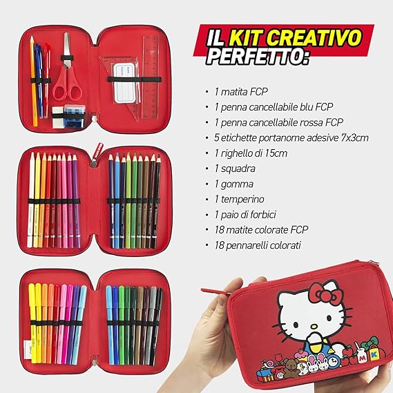 COMPLETO: Include 18 matite colorate mina 4.0, 1 matita grafite, 1 gomma, 1 penna cancellabile blu e 1 rossa, 1 righello, 1 temperino, forbici con punta arrotondata, 1 squadra, 5 etichette portanome adesive 7x3cm
