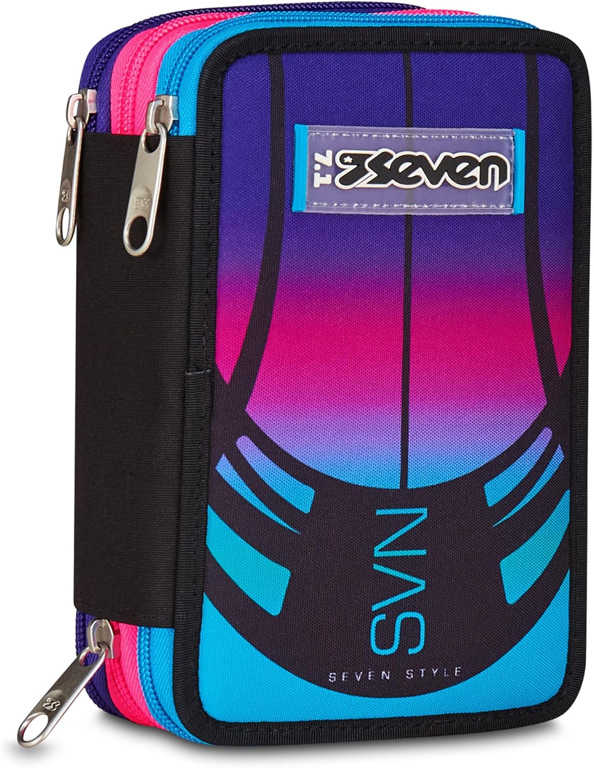 1 penna cancellabile blu, 1 penna sfera rossa, 18 pastelli a colori 4.0 esagonali, 18 pennarelli superlavabili punta 3.0, 1 matita grafite esagonale HB, 1 colla gialla azzurra, 1 gomma bianca con cartoncino stampato, 1 temperino barilotto 2 fori, 1 righello trasparente, 1 matita bicolor rosso/blu, 1 paio di forbici in metallo Perfetto per accompagnare le giornate scolastiche dei bambini, questo astuccio a triplo scomparto è la soluzione ideale per organizzare al meglio tutto l'occorrente. Con il suo design colorato, è pensato per bambine delle Scuola Elementare. Realizzato in resistente tessuto di poliestere, questo astuccio unisce praticità e qualità, perfetto da abbinare a qualsiasi zaino scolastico.