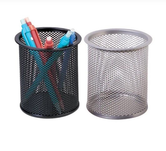 Bicchiere portapenne cilindrico in rete metallica. Formato 8,5x10 cm. Disponibile in due colori: bianco o nero.