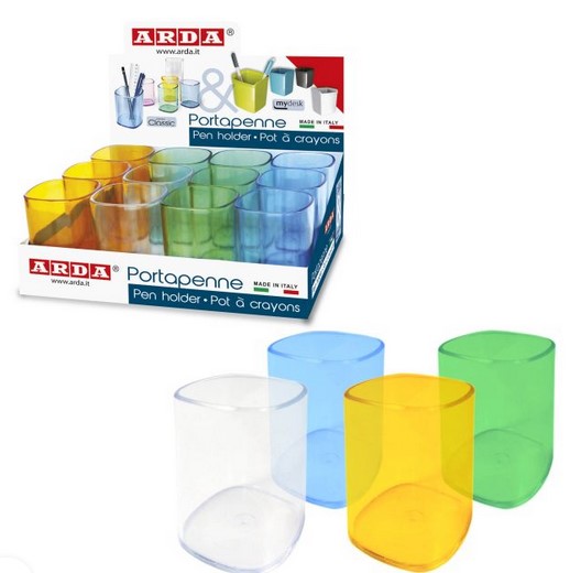 Bicchiere portapenne, marca Arda, in plastica trasparente, colori assortiti. SI PREGA DI SPECIFICARE IN FASE DI ORDINE IL COLORE/MODELLO DESIDERATO ALTRIMENTI VERRA' SPEDITO CASUALMENTE.