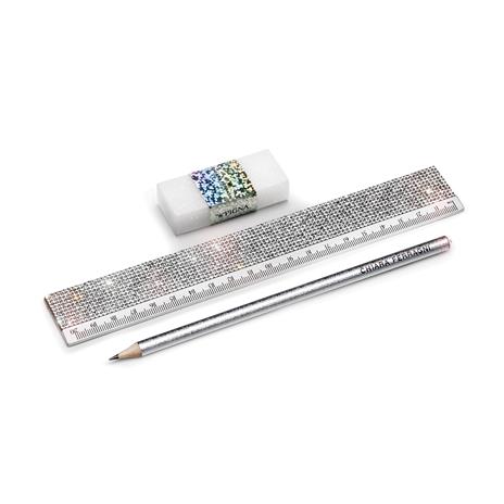 Blister composto da righello glitterato + gomma trasparente glitter con fascetta olografica + matita effetto cangiante.