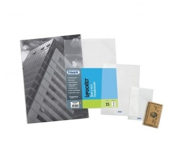 Buste a sacco Favorit Upocket, realizzate in polipropilene con finitura liscia trasparente. Aperte sul lato superiore e con un formato di 30x42 cm. Conf. 25 pezzi.