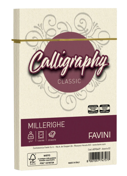 Busta adesiva con strip da 100 grammi in carta calligraphy con tramatura millerighe. Formato 120x180mm. Confezione: 25 pezzi.