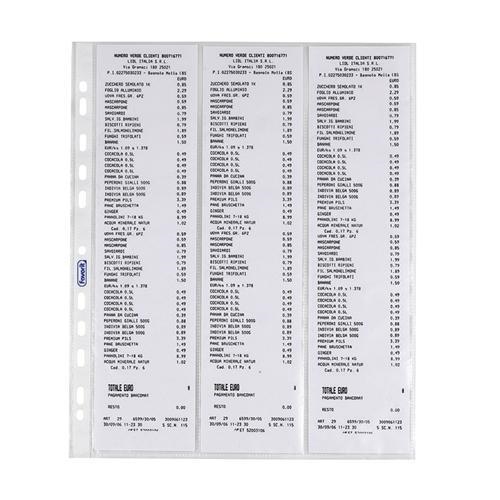 Queste buste permettono di archiviare scontrini fiscali in 6 tasche (3 sul fronte e 3 sul retro) da 7x30 cm.