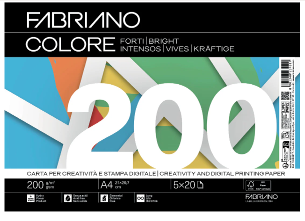 -Carta naturale colorata in massa e in superficie. -Qualità ottima prodotta con il 100% di cellulosa ECF certificata FSC proveniente da foreste gestite secondo rigorosi standard ambientali sociali ed economici. -Acid Free con riserva alcalina a garanzia di lunga conservazione. -Long Life (ISO 9706). -Idonea per fotocopie stampa laser stampa inkjet divisori copertine e collage. -Ogni risma è composta da 20 fogli per 5 colori forti: giallo verde azzurro rosso e aragosta. -Formato A4.