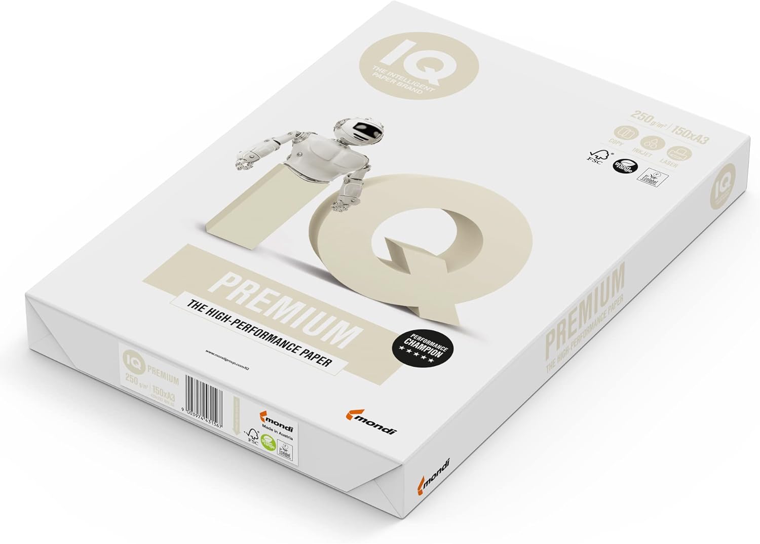 Carta Mondi IQ Premium per fotocopie (250 gr) - A3 bianca - 150 fogli per risma. Carta di elevatissimo punto di bianco, affidabile su tutte le fotocopiatrici e stampanti digitali laser ad altissima velocità. La ''colorlok technology'' garantisce un ottimo risultato anche per le stampe a colori ink-jet. Carta certificata fsc.