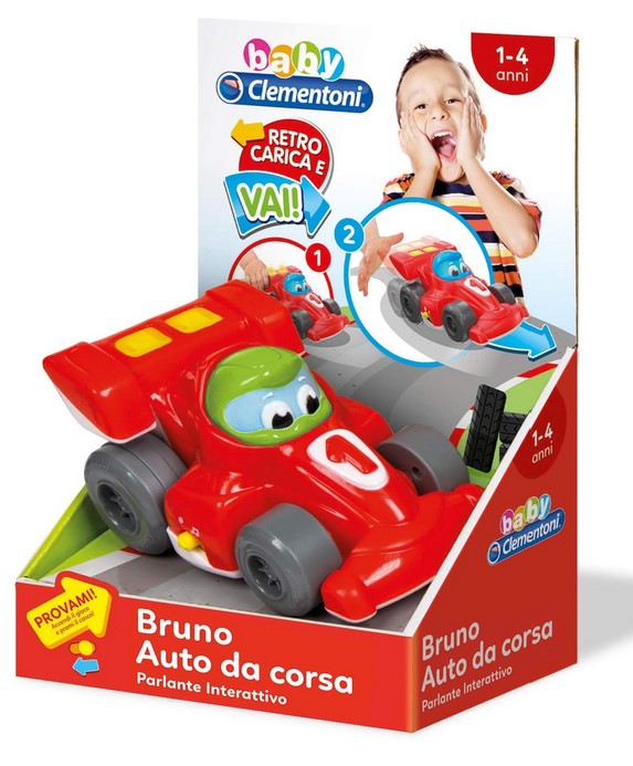 Clementoni Baby Clementoni auto Bruno Formula 117216 -Una grintosa auto da corsa a retrocarica per sfrecciare verso il divertimento.Premendo la testa del pilota si attivano gli effetti sonori di una vera formula 1 e le luci lampeggiano davvero facendo divertire il bambino.Stimola la percezione visivo-uditiva dei più piccoli, la manualità e la comprensione della relazione causa-effetto.