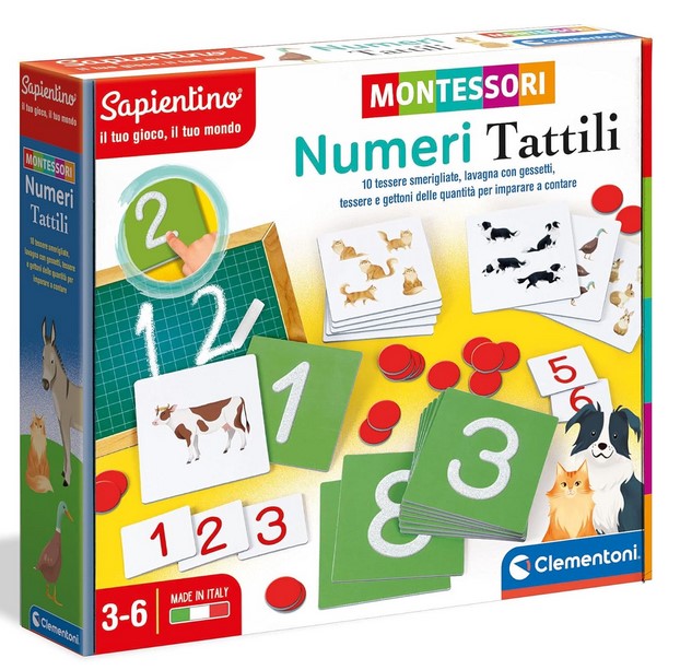 NUMERI TATTILI: un gioco educativo ispirato al metodo Montessori per introdurre i bambini al mondo dei numeri; il kit include tessere tattili con cifre smerigliate e accessori per stimolare il pensiero logico e numerico IMPARARE GIOCANDO: il gioco guida i bambini a riconoscere e memorizzare la forma dei numeri attraverso il tatto, favorendo l’associazione tra numeri, quantità e concetti matematici come pari e dispari, in modo intuitivo e coinvolgente COME GIOCARE: i bambini esplorano i numeri toccando le cifre smerigliate, utilizzano i gettoni per distinguere tra pari e dispari e completanole attività di conteggio e associazione con tessere quantità; un’esperienza educativa e interattiva COSA CONTIENE: gioco educativo Made in Italy; adatto per bambini dai 3 ai 6 anni, include 10 tessere smerigliate, 11 tessere numeriche, 57 gettoni pari e dispari, una lavagna, gessetti, cancellino e 11 tessere quantità