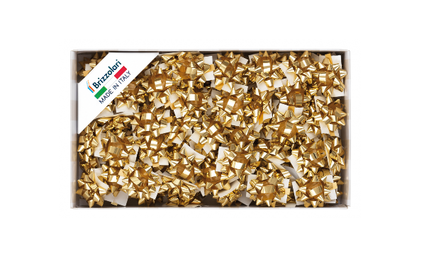 100 coccarde dorate lucide da 6,5 mm di grandezza, perfette per impreziosire i vostri pacchi regalo.