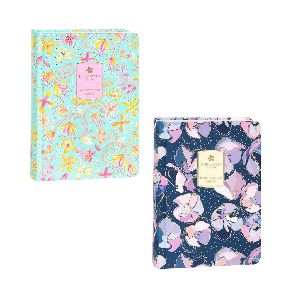 Turnowsky diario mini giornaliero 13 mesi 2025/2026 daily planner - Floreal. Con dimensioni compatte 11x15,3 cm. In due fantasie: Dark Flowers o Summer Flowers.