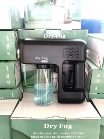 Nebulizzatore elettrostatico a freddo, con erogazione ultra basso volume (ULV) che permette un’efficace azione di disinfezione su tutte le superfici, oggetti e tessuti senza bagnare.