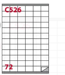 Fogli di etichette adesive in carta bianca prefustellate, per stampanti laser, ink jet e fotocopiatrici. Collante permanente o removibile. Formato del foglio di supporto 210 x 297 mm (A4). 72 etichette su ogni foglio a4.