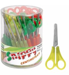 Forbici centimetrate Snippy per bambini mancini con lama in acciaio inox dalla punta arrotondata. Confezionate in barattolo da 24 pezzi.