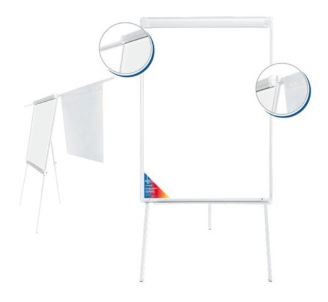 Lavagna portablocco cm. 70x100 su treppiede. Superficie in acciaio laccato bianco, magnetica e scrivibile. Cornice in alluminio. Portapenne. Ganci portablocco e prolunghe laterali estensibili.
