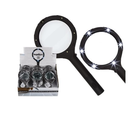 Lente d'ingrandimento con 6 luci Led. Per 2 pile (AA). Ca. 24 cm. 15 pezzi per display.