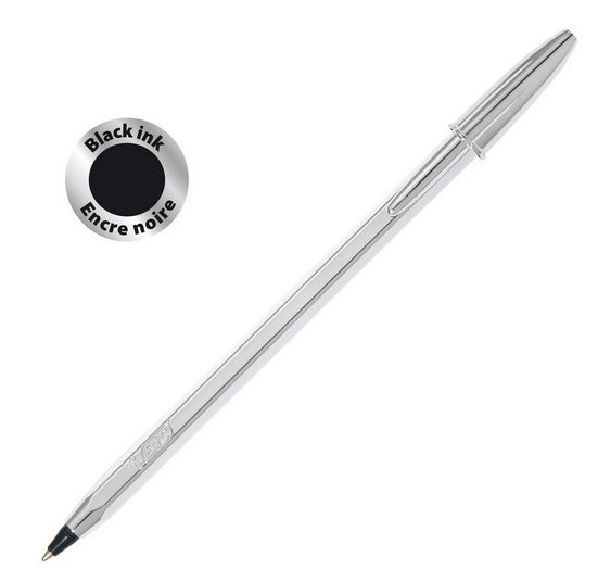 La classica Bic Cristal media con punta da mm 1 in versione Shine silver con fusto color argento, inchiostro nero.