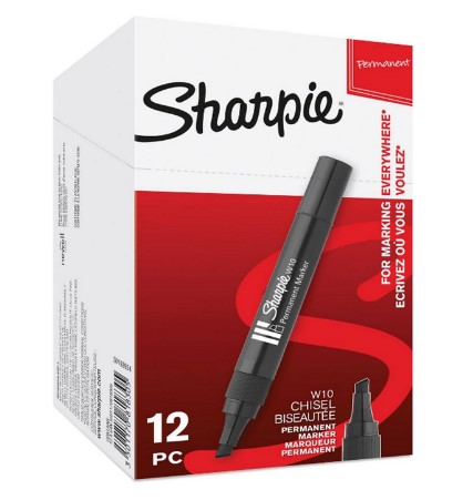 Marcatore ad inchiostro permanente. Punta a scalpello in poliestere. Scrive su quasi tutte le superfici. Non secca anche se lasciato aperto per 14 giorni. Nero. Confezione da 12 pennarelli.