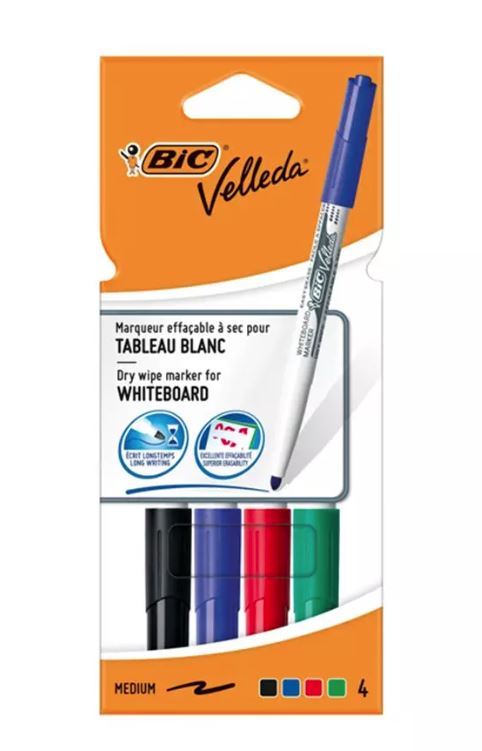 Marcatore per lavagne Velleda con inchiostro a base chetone, senza xilene ne toulene. Fusto da 4 pennarelli in plastica facile da impugnare. Punta tonda ultra resistente con larghezza di tratto 1,4 mm. Cappuccio del colore dell'inchiostro con blocco di sicurezza.