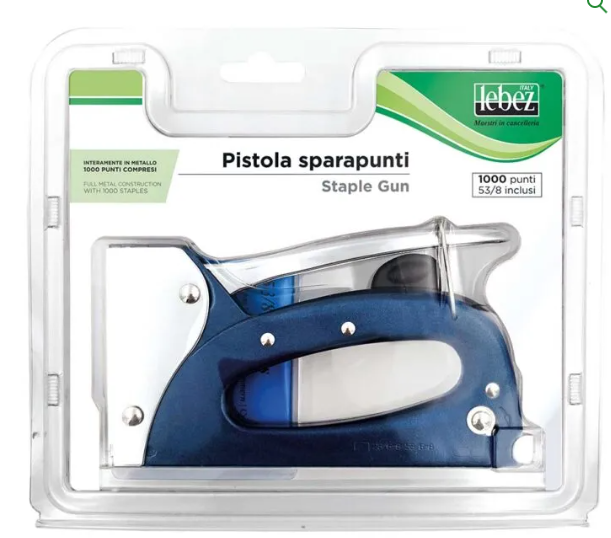 Pistola sparapunti in metallo con chiusura di sicurezza in blister con 1.000 punti zincati.