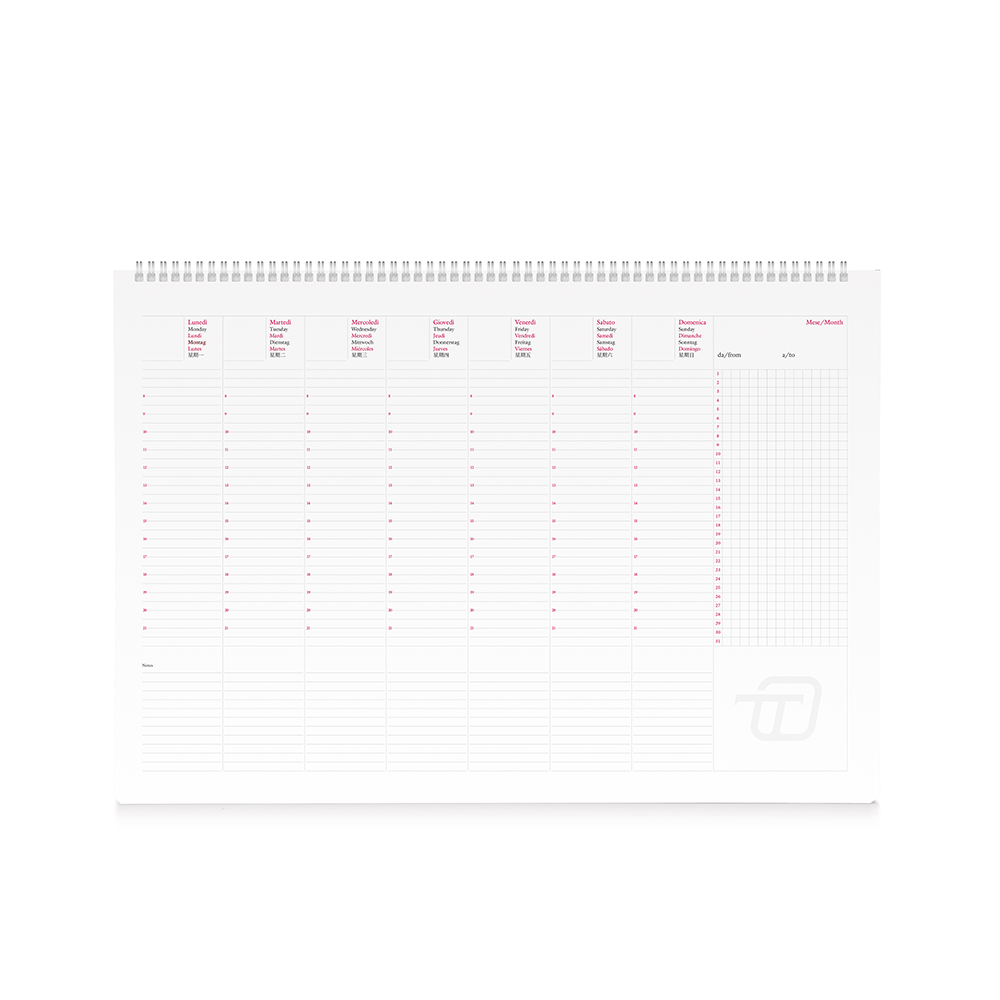 Planning settimanale da tavolo perpetuo in carta bianca, con spirale in metallo, settimana in verticale e note laterali e copertina in polipropilene sabbiato trasparente.