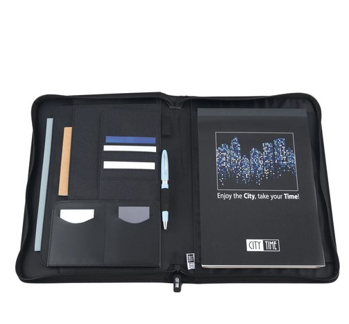 Portablocco in tessuto tecnico bicolore. Formato a4, chiusura con zip, scomparti per biglietti, tasca interna portadocumenti, portapenna, completo di blocco. Dimensioni 26x34cm.