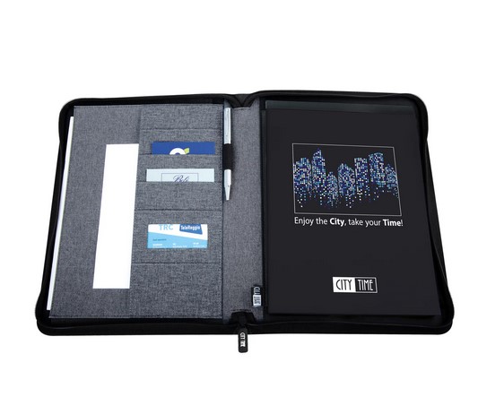 Portablocco in tessuto tecnico e chiusura in ecopelle. Formato a4 chiusura con zip, tasca esterna con chiusura a bottone, scomparti per biglietti, tasca interna portadocumenti, portapenna, completo di blocco.
