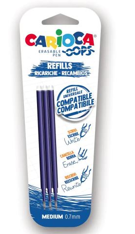 Refill cancellabile Carioca Oops. Compatibile con le principali marche di penne cancellabili ad inchiostro termosensibile. Tre ricariche 0.7mm, inchiostro Blu