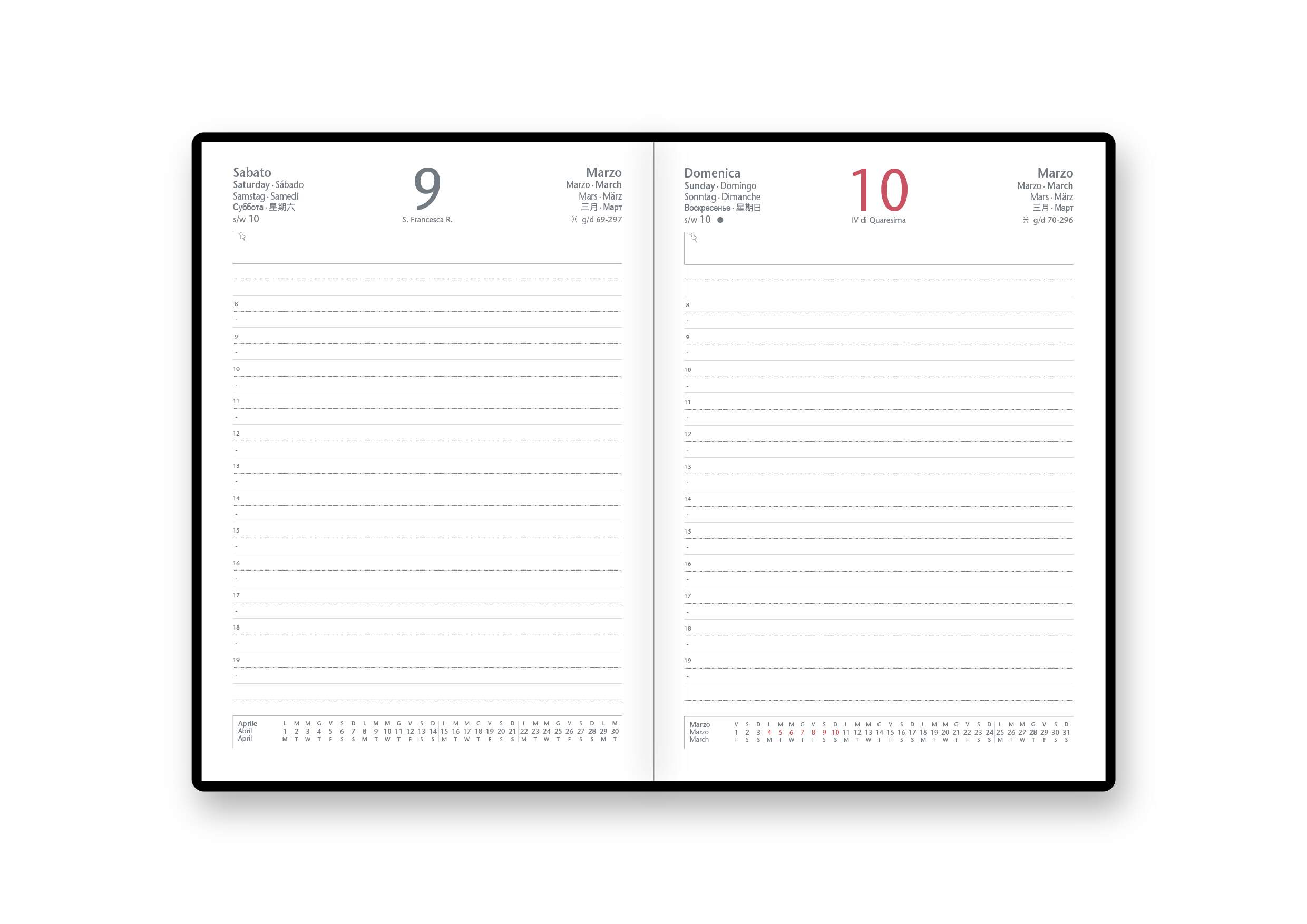 Ricambio per agenda giornaliera fasciata in cartoncino grigio, carta bianca e stampa a 2 colori, un giorno per pagina, riepiloghi mensili di cassa a fine anno, 7 lingue (italiano, inglese, spagnolo, francese, tedesco, russo, cinese), rubrica fissa non scaleggiata.