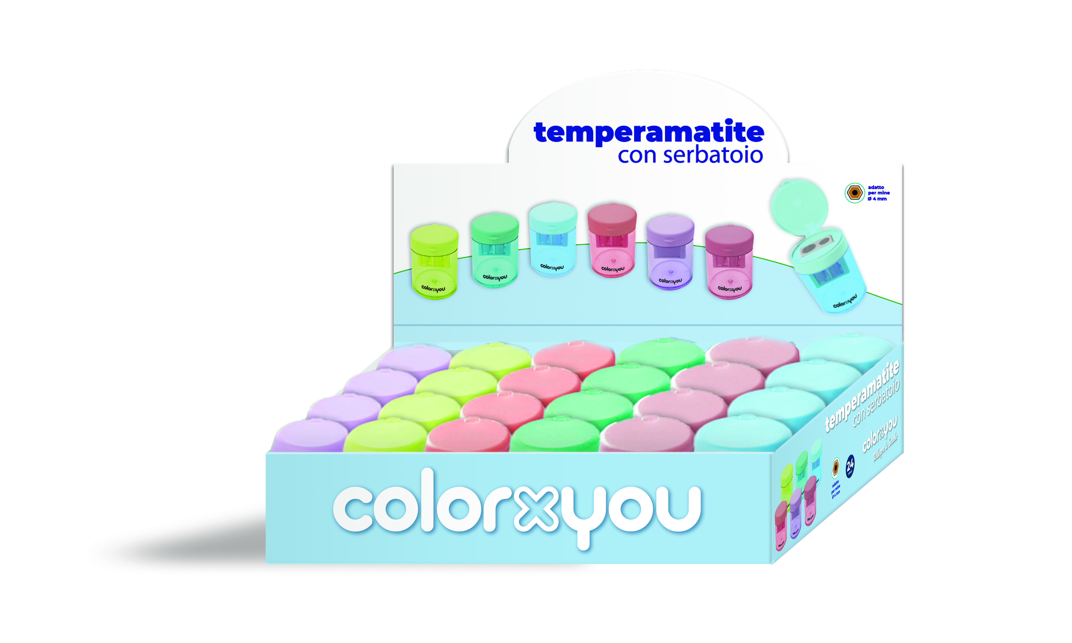 Temperamatite a 2 fori con serbatoiotrasparente. Adatto per mine fino a4 mm. 6 delicate tinte pastello.