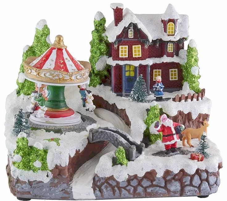 Scenografia natalizia raffigurante un villaggio con giostra funzionante a batterie (3xAA incluse) con interruttore per l'accensione e spegnimento e completo di musiche natalizie.