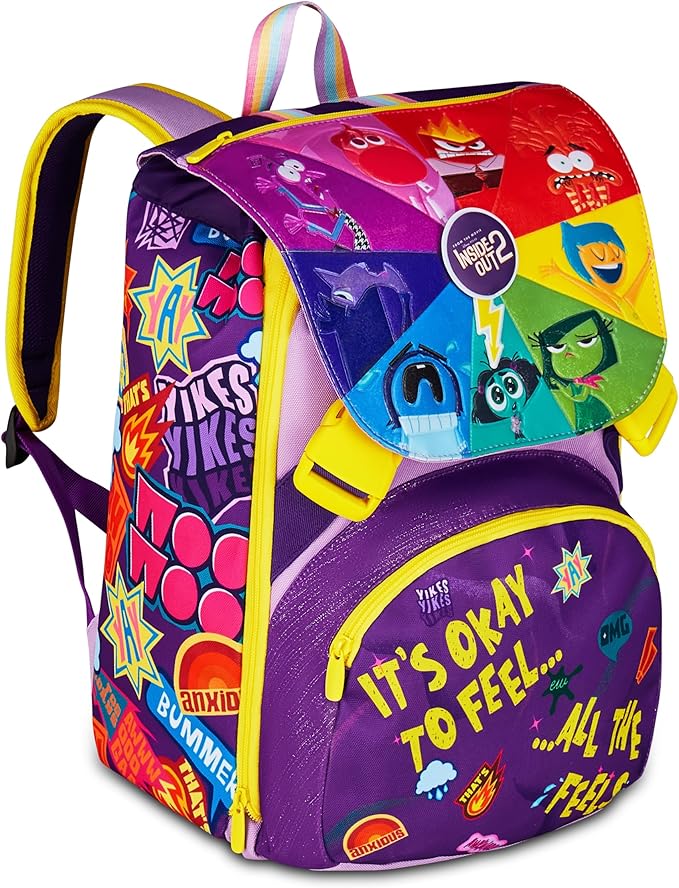 Dimensioni: 27x39x16 cm - capacità chiuso 24 L; aperto 27 L Schienale: preformato; Spallacci: imbottiti e rivestiti in tessuto e rete Zaino sdoppiabile con tasca frontale e tasca laterale porta borraccia in rete. Zip colorate. Stampa digitale su pvc lucido scintillante e indicatore di emozioni applicato sul pannello frontale. Maniglia in nastro stampato. Tessuto: poliestere Lo Zaino Sdoppiabile Inside Out 2 è la scelta perfetta per le bambine che cercano uno zaino capiente, confortevole e dal design colorato! Ideale per la scuola elementare, grazie alle zip laterali, è possibile ottenere ancora più spazio.