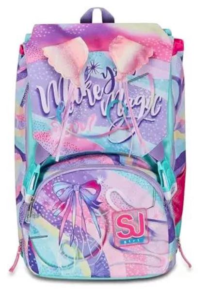 Sagomatura anatomica degli spallacci, imbottiti e rivestiti in tessuto e rete; Zaino estensibile tramite zip laterali, ali scintillanti sollevabili tramite sistema ad aria dagli spallacci a pressione. Dettaglio nastri volteggianti fissati alle ali. Fantasia allover e stampe posizionate. Tasca in rete portaborraccia. Etichetta in gomma personalizzata con logo SJ.