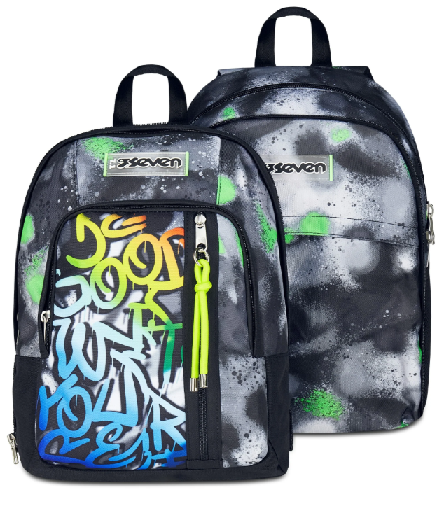 Davanti a te hai una giornata piena di impegni fra la scuola, gli allenamenti e un giro al parco nel tempo libero. E tu per affrontarla hai messo tutto quello che ti serve nel capiente doppio scomparto del tuo nuovo zaino Seven Dual Detach: lo zaino che quando hai bisogno diventa uno zainetto, semplicemente sganciando tramite zip lo scomparto anteriore. Tutto è al proprio posto: libri e quaderni,tablet o PC nell’apposito scomparto interno. la borraccia nella tasca laterale e anche il cambio da metterti dopo allenamento. Mentre il telefono, gli auricolari e l’agenda sono nella tasca frontale con organizer. E poi sai che spostarti da un posto all’altro è comodo: spallacci e schienale sono confortevoli e il fondo integrato mantiene il carico sempre ben bilanciato.